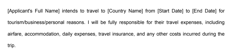 [Applicant's Full Name] intends to travel to [Country Name] from [Start Date] to [End Date] for tourism/business/personal reasons. I will be fully responsible for their travel expenses, including airfare, accommodation, daily expenses, travel insurance, and other costs.