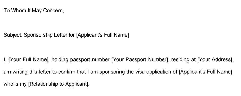 Here are the applicant’s details: Full Name – [Applicant's Full Name], Date of Birth – [DOB], Passport Number – [Applicant's Passport Number], Relationship – [Relationship with the sponsor], and Travel Dates – [Start Date] to [End Date].