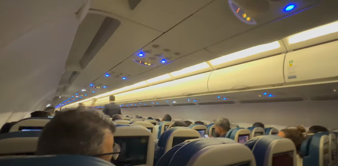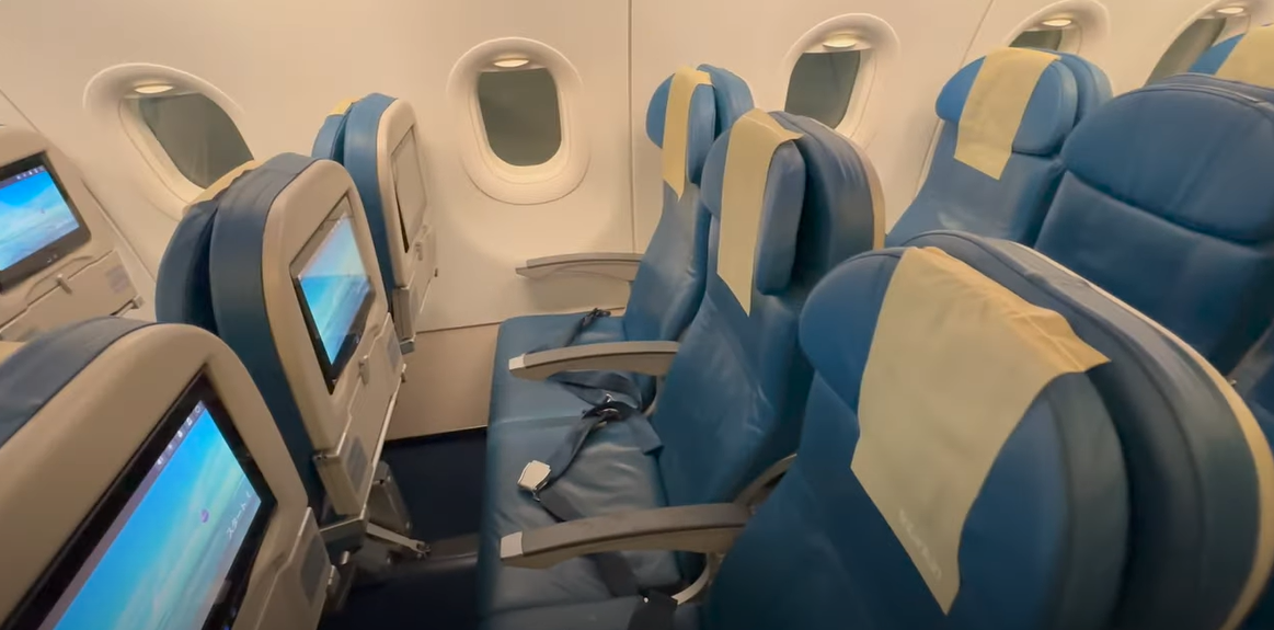 As I stepped inside the aircraft, I noticed the bright, tropical vibe of the economy cabin. The seats were covered in a turquoise-blue pattern with a hint of tropical design, arranged in a 3-3 configuration on this A320 model (the bigger Airbus A330 aircraft also used on this route has a 2-4-2 setup).
