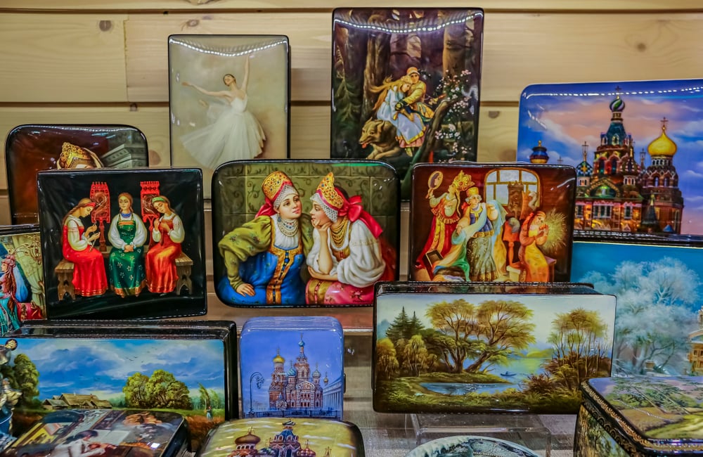 Don't miss the intricate Russian lacquer boxes whenn thinking about the best things to buy from Russis. These beautifully hand-painted items are often adorned with scenes from Russian folklore or literature, making each one a miniature work of art. Lacquer box painting began in several Russian villages in the 18th century, with the most famous coming from Palekh, Mstera, Fedoskino, and Kholuy. Each village developed its distinct painting techniques, making these boxes beautiful and historically significant artefacts that reflect the unique artistry of different regions.
