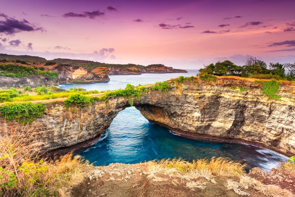 Broken Beach, known locally as Pasih Uug, is a surreal coastal formation where a massive cave roof collapsed, creating a circular cove surrounded by towering cliffs. The centrepiece is a natural stone arch connecting the enclosed bay to the open sea, allowing waves to flow in and out with rhythmic grace.