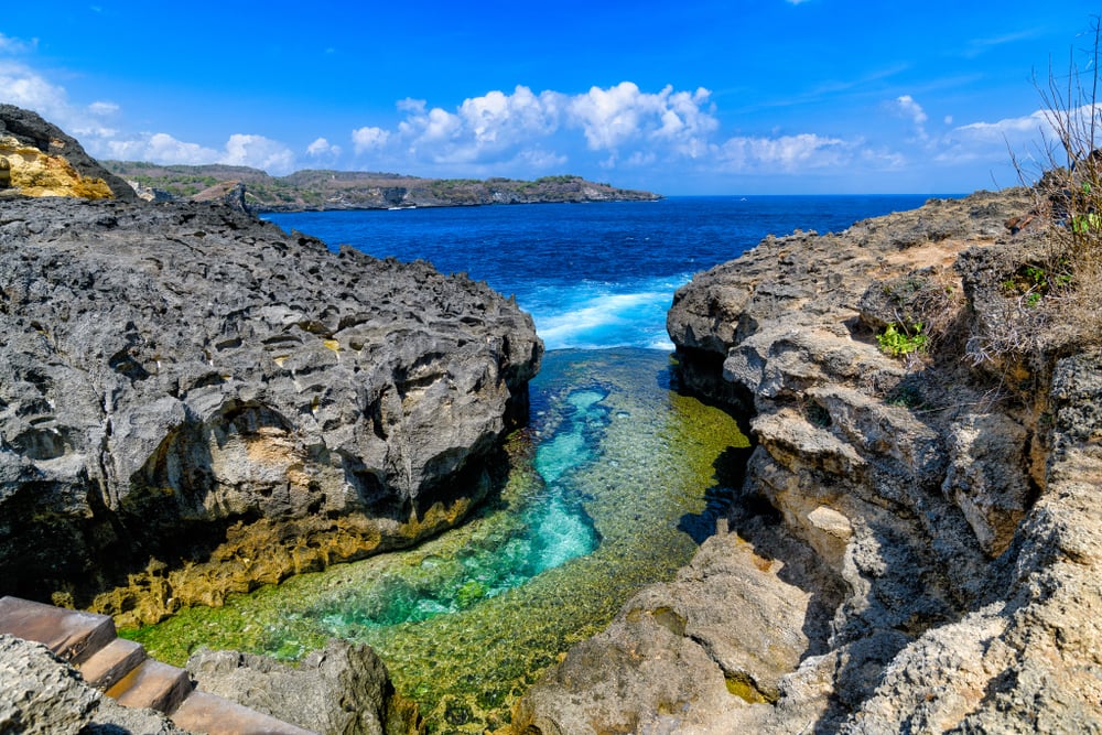 Tucked along Nusa Penida’s rugged western coastline, Angel’s Billabong is a natural infinity pool carved into the rocky shore. During low tide, its emerald-green waters become still and clear, reflecting the sky above and offering a surreal swimming experience. With cliffs on either side and waves crashing just beyond the edge, it’s a striking spot where the ocean meets stone in a dramatic embrace.
