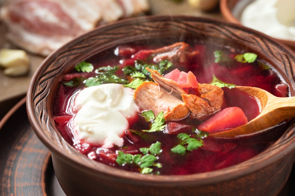 Borscht: This vibrant beet soup is a staple of Russian kitchens. The combo of earthy flavors and tangy sour cream makes it a favorite.
