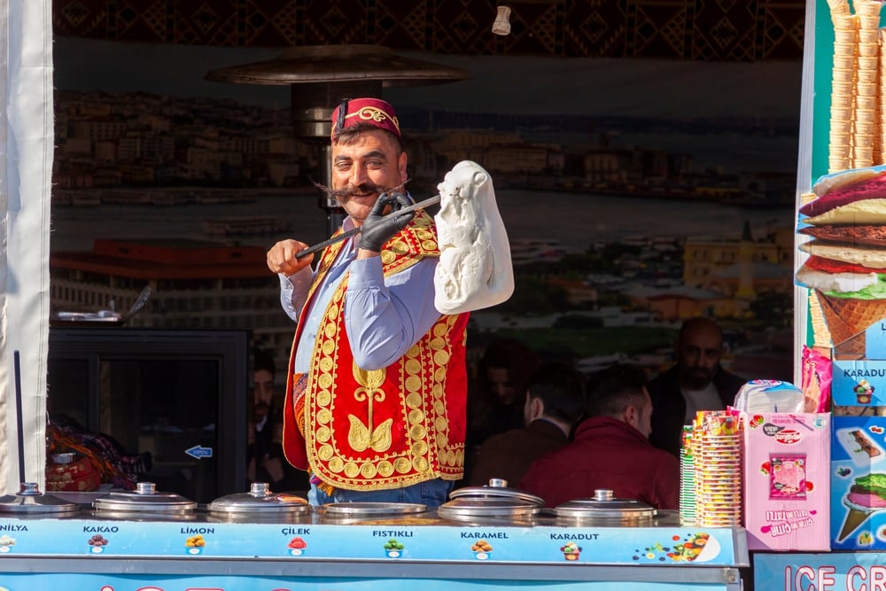 Turkish ice cream vendors put on a show. The tricks and playful teasing make getting a cone a hilarious game.