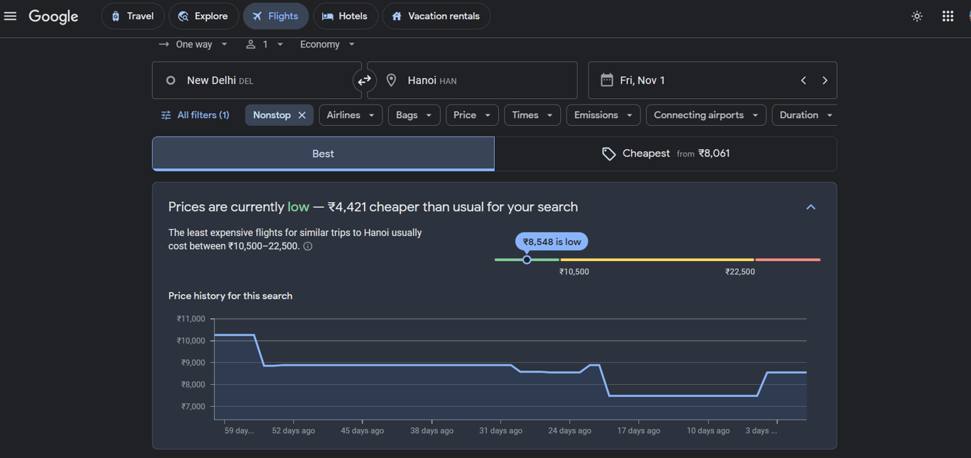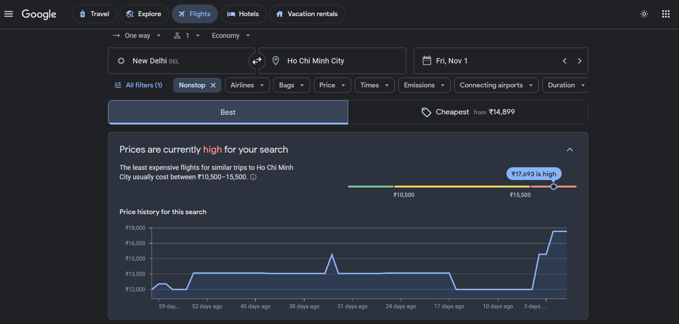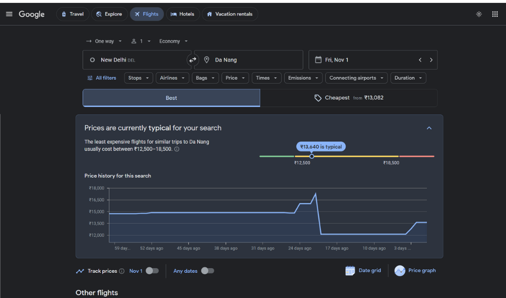 See the pictures below comparing the price history for the last 60 days for flights from Delhi (India) to Hanoi, HCMC and Da Nang: