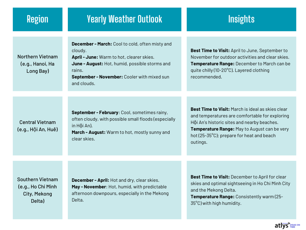 While the south stays warm and humid year-round, the north experiences more seasonal changes, with a noticeable winter. The central region experiences intense heat and heavy rains at certain times. Additionally, Central Vietnam is also prone to tropical storms, especially between September and November, which can bring sudden downpours and occasional flooding.