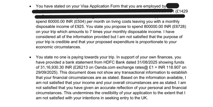 Visa officers refuse applications when your money story doesn’t make sense. If your bank balance can’t realistically cover flights, hotels, and daily costs, it looks risky. Sudden big deposits right before you apply without proof like a sale deed, gift/loan letter, or bonus letter, suggest “borrowed” money. Income that doesn’t match bank credits (payslips say one thing, statements show another) also raises doubts. For routes with maintenance rules (e.g., Student/Work), not holding the required funds for the full period or dipping below the limit is a common fail. In short, officers want stable, traceable, and sufficient funds that clearly fit your