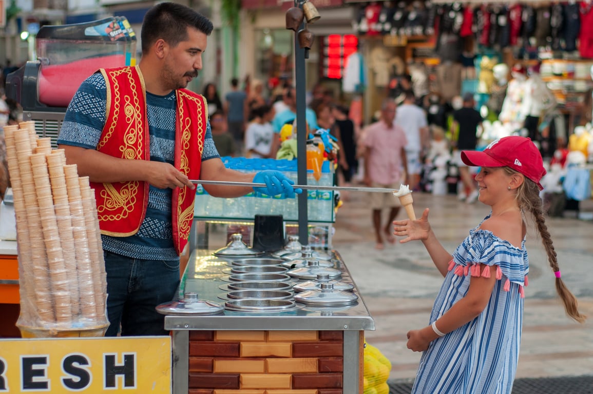 Getting served Turkish ice cream is less about the ice cream itself and more about the playful prank the vendors pull on you. The dondurma (Turkish ice cream) vendors are known for their tricks—twisting, turning, and flipping your cone out of reach just as you think you’re about to grab it. It’s a hilarious experience that feels like a mini street performance.