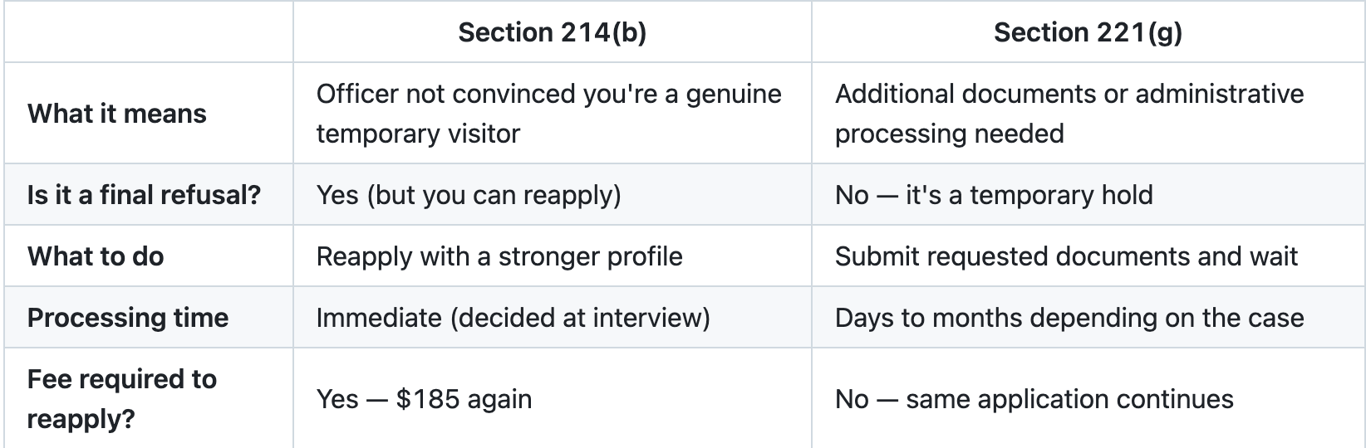A 214(b) is a final refusal — the officer decided you don't qualify. A 221(g) is a temporary hold requesting additional documents or administrative processing. With 221(g), you don't need to reapply or pay again — just submit what's requested and wait.