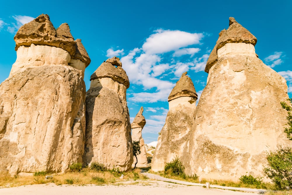 Pasabag, also called Monks Valley, is one of Cappadocia's most visually iconic parts. Here you’ll find the famous mushroom-shaped fairy chimneys, tall columns of stone topped with dark, rounded caps, formed by layers of lava and volcanic ash resisting erosion at different rates.