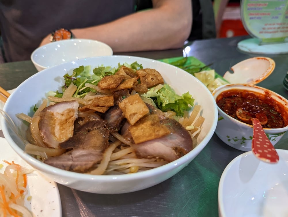 Cao lau: A Hoi An specialty, this bowl of thick noodles topped with pork, greens, and crispy croutons typically costs around 40,000 VND ($1.75). One slurp, and you’ll be hooked.