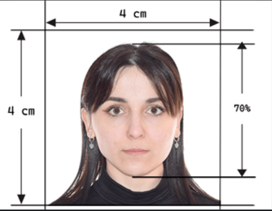 The photo must be 40mm x 40mm. The face should take up 70–80% of the image. The head must be upright and centered.