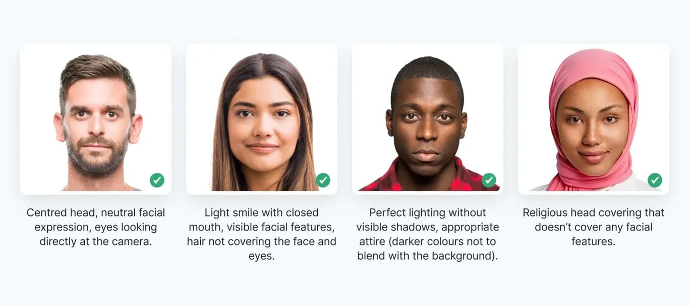 Religious or medical head coverings are allowed, but they must not hide any part of your face. The headgear should be plain and not cast any shadows.