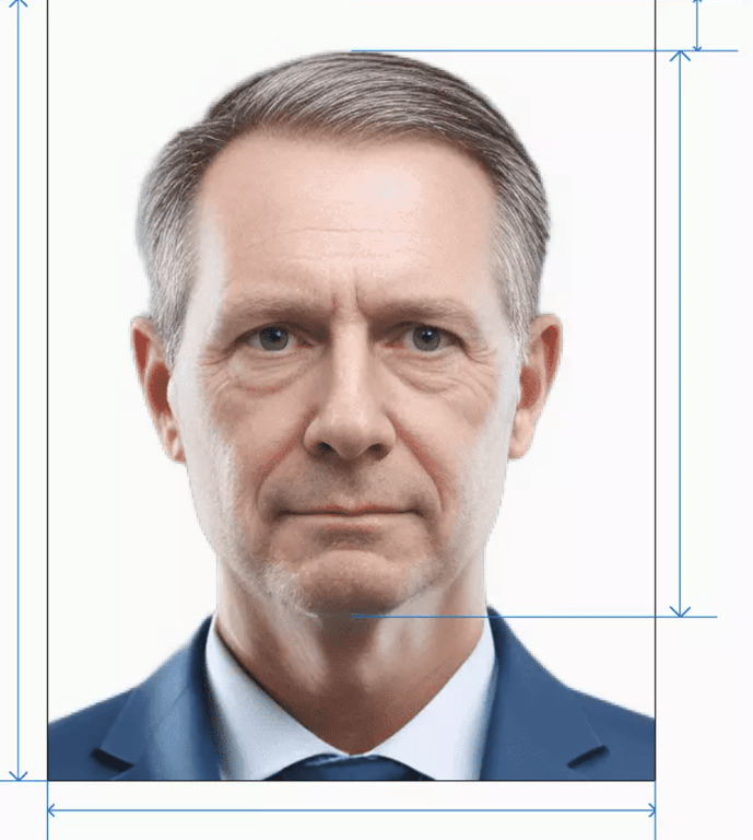 Height and Size: 35 × 45 mm; the head should occupy 70 to 80 percent of the image height