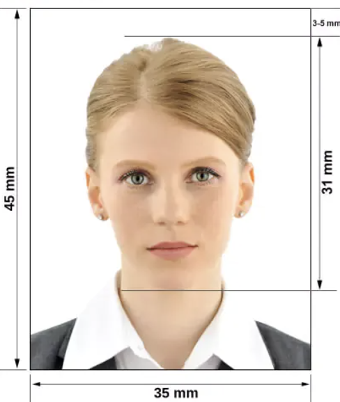Your photo must be 35 x 45 mm, with your head height between 32–36 mm, occupying 70–80% of the frame.