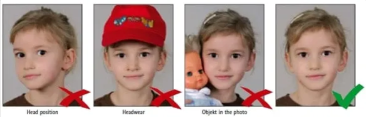 The same photo rules apply for children. Each child must be photographed alone, with a white background and a clear frontal view of the face. Toys, pacifiers, and other objects should not appear in the photo.