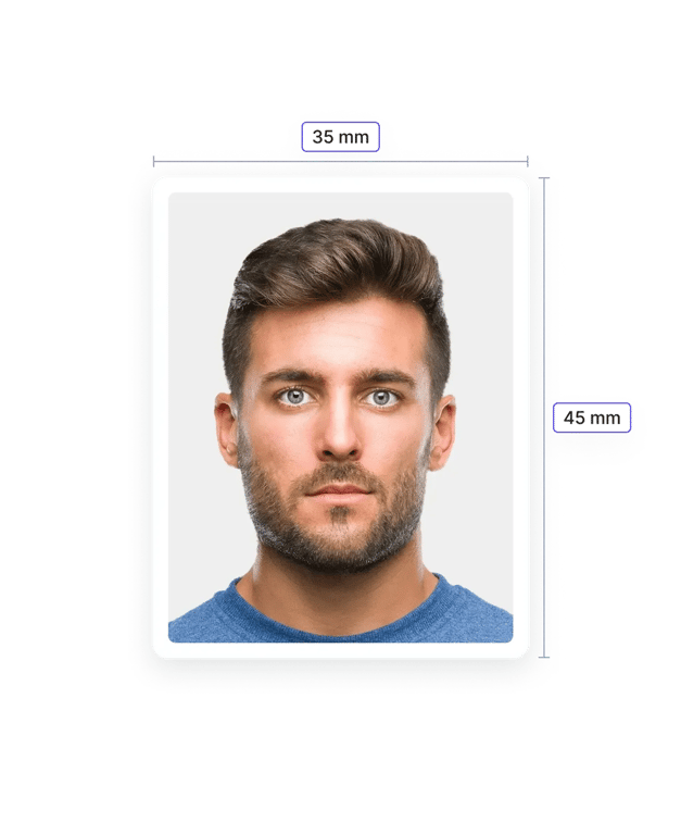 The official Spain visa photo size is 35mm x 45mm (width x height). Your face should occupy 70–80% of the photo (around 32–36mm from chin to crown), as per Spain Schengen visa photo requirements.
