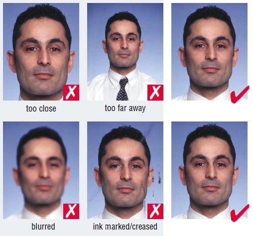 You should show your face square on to the camera, no portrait style (not looking over ones shoulder) or tilted and showing both edges of face clearly. The facial expression must be neutral, mouth closed and looking directly at the camera.