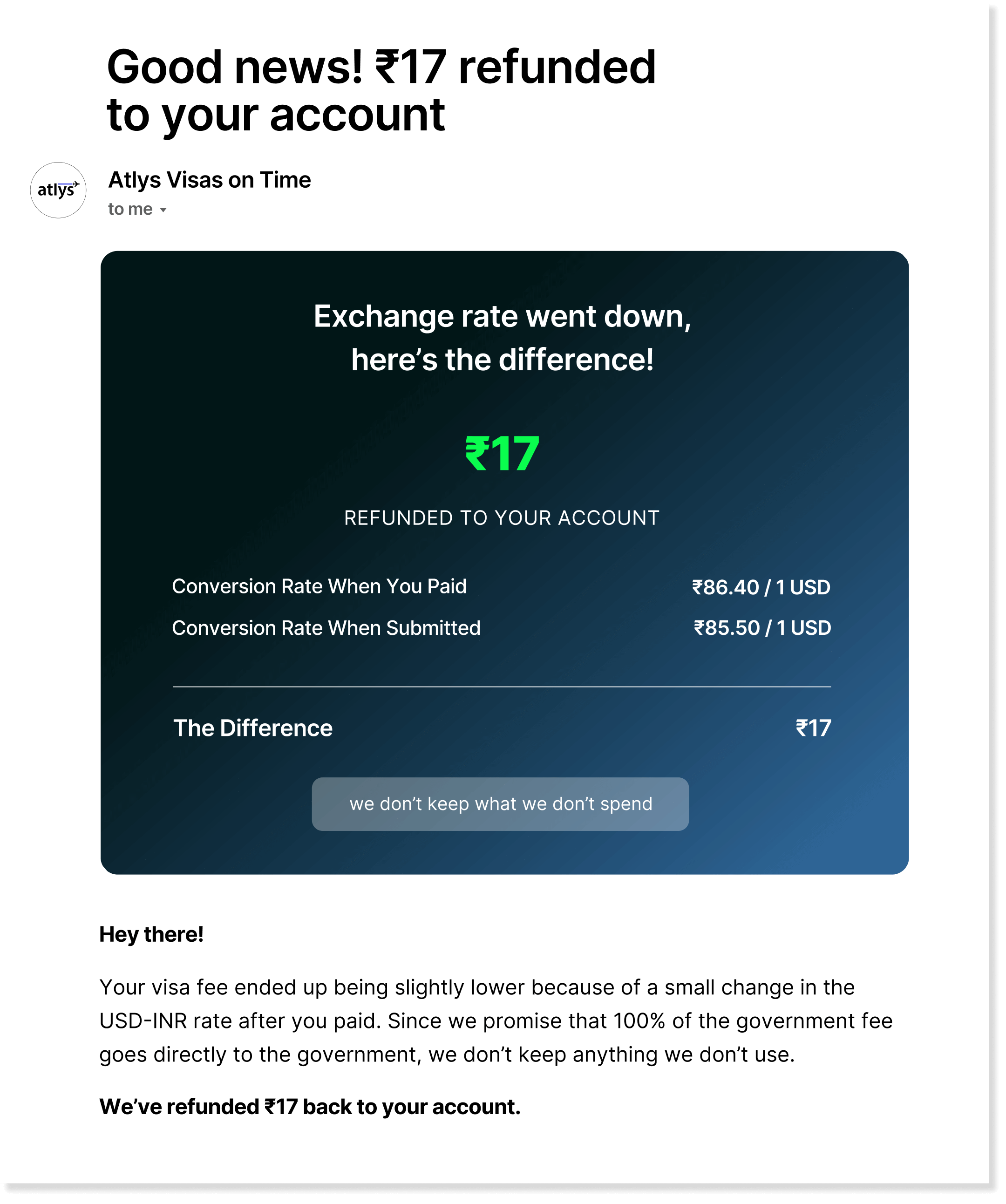 Exchange rates fluctuate. If the exchange rate drops between when you pay and when we submit your application to the government, we refund the difference. Automatically.
